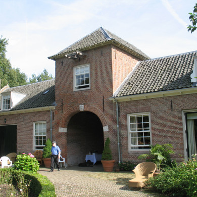 Ingangszijde: een dubbele halfronde poort, met in rechter poortdeur een getoogd winket, omlijst door wigvormige zandstenen boogstenen met een zandstenen sluitsteen met mascaron. Boven de sluitsteen een zandstenen gevelsteen met het wapen van de stadhouder Prins Frederik Hendrik. Aan het voorplein is de halfronde poort voorzien van twee wigvormige geprofileerde zandstenen aanzetstenen en van een zandstenen sluitsteen met leeuwenkop in reliëf. Op het eerste verdieping-niveau van het verhoogde middengedeelte aan voor- en achterzijde een schuifvenster met 6-ruitsindeling. Aan voorpleinzijde links van het verhoogde middengedeelte een dubbele staldeur en een getoogd schuifvenster met 12-ruitsindeling. Rechts van de poort van links naar rechts een venster als boven, een deur met bovenlicht met ruitvormige roedenverdeling. Links van het verhoogde middengedeelte aan de zijde van het poortgebouw, dat aan de oprijlaan grenst, twee getoogde vensters met 9-ruitsindeling.