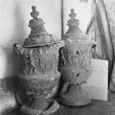 De twee gecanneleerde klokvormige zandstenen vazen met deksels dateren uit het einde der 17e eeuw en staan op de hoeken aan de oostelijke zijden van de vleugels van het hoofdgebouw opgesteld. Oorspronkelijk maakten deze vazen deel uit van een serie, die de bakstenen muur rond de binnentuin bekroonde.