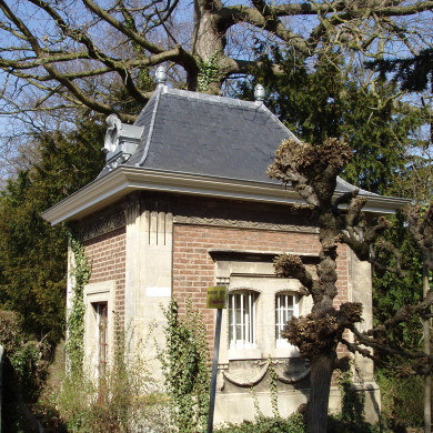 POMPHUISJE. Ornamenteel onderkelderd in rode baksteen opgetrokken pomphuisje, gelegen aan de entree naar het park op de as van de Hommerter allee. Onder het huisje een zeven meter diepe stenen waterput met buizensysteem voor de distributie van water naar de buitengracht. Het huisje, dat zich voordoet als een ornamenteel wachtershuisje of kiosk is gebouwd op vierkante grondslag en is overkapt door een hoog opgetrokken afgeplat met leien gedekt schilddak (maasdekking) met vier pijnappels op de hoeken. Aan de hoeken van de gevels zijn omgaande hardstenen blok-pilasters aangebracht, die worden afgesloten door een fries met trigliefen en een kroonlijst (tevens gootlijst) met eierlijst. Tussen de pilasters onder de kroonlijst een stenen sierband met voluten. Aan de oprit(Z-)- en NW-zijde van het huisje, dat omgaande van een hardstenen voeting is voorzien, een groep van twee segmentboog-vormige vensters met 6-ruitsvensters met diefijzers in een ornamentele mergelomlijsting met guirlandes aan de onderzijde. Centraal aan de ZW- en NO-zijde een deur in een ornamentele stenen omlijsting, die aan de bovenzijde naar opzij rechthoekig uitzwenkt. Centraal op de verdieping aan deze zijden een ornamentele loden dakkapel met rond 4-ruitsvenster. De dakkapel wordt bekroond door een loden voluutvormig ornamentstuk en is aan de onderzijde van guirlandes voorzien. Het pomphuisje dateert uit het einde van de 19e eeuw en werd wellicht omstreeks 1886 gebouwd, toen centraal aan de parkzijde van de hoofdvleugel van het kasteel een monumentaal bordes werd gebouwd.