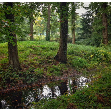 Terrein waarin overblijfselen van de versterkte hofstede Groot-Zandbrink. Datering: middeleeuws.