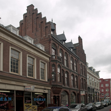 Het pand op rechthoekige plattegrond is zeven vensterassen breed en omvat drie bouwlagen onder een met pannen gedekt zadeldak. De gevels zijn bekleed met verblendsteen en geglazuurde baksteen. De beide vensterassen op de rechterhoek worden bekroond door een rijk gedetailleerde trapgevel met in baksteen uitgevoerde nissen met traceringen, kolonnetten en fioelen. Ook de linker zijgevel draagt een trapgevel met nissen en ezelsrugafdekkingen, waartegen het zadeldak aansluit. De voorgevel bezit friezen met terracotta decoraties tussen de verdiepingen, in korfboognissen geplaatste vensters met terracottaversiering in de boogtrommels, een gemetseld boogfries en een zaagtandfries onder de gootlijst en een gedecoreerd fries met zes maskerkopjes onder de trapgevel. De parterre bevat de ingangen en drie in segmentboogomlijstingen gevatte etalageruiten. Tegen de meest linkse travee is op de verdieping een driezijdig uitgebouwde, gemetselde erker aangebracht, rustend op een rijke onderkraging met tandfriezen, boogfries en fries met terracottaversieringen. De vensters van de erker zijn gevat in spitsboogomlijstingen met lofwerk van terracotta in de boogvelden en in het boogveld van het middelste venster het bouwjaar 1889. De erker wordt bekroond door een klein balkon met gemetselde borstwering. De gevel bezit voorts een aantal sierankers. Het zadeldak draagt een gemetselde schoorsteen met afgeschuinde hoeken en geprofileerde rand, en telt drie dakkapellen met leien dakjes en pirons. Waardering.