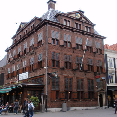 Voormalig Stadhuis - oudste deel HOEKGEBOUW Dagelijkse Groenmarkt-Kerkplein (1564-'65), een van de rijkste voorbeelden van de vroegere renaissance - in 1773 en volgende jaren vergroot met een vleugel langs het Kerkplein, bekroond door beeldhouwwerk van J.B.