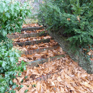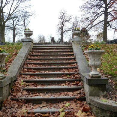 BAKSTENEN TRAP. Rode bakstenen trap van 6 treden in de ZO-hoek van de historische aanleg, die naar het tegen de achtermuur van het park gesitueerde langwerpige smalle rechthoekige bordes leidt. De trap, die in de tweede helft van de 19e eeuw werd gebouwd, is nog deels van de originele bekleding van slakken voorzien en maakte deel uit van een ornamentele compositie met ondermeer een rustica-formatie van slakken en enkele trappen op de overgang van het park van Blumenthal en het park ten zuidoosten hiervan (thans openbaar park); deze compositie is thans nauwelijks meer herkenbaar.
