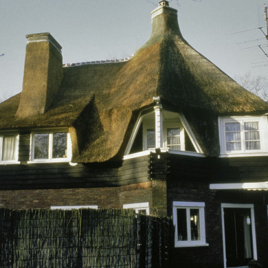 "De Bark". Op een schipvorm geinspireerde VILLA, genaamd "de Bark", op een pijlvormige plattegrond in baksteen opgetrokken onder hoog opgaande rieten kap - die aan de boegvormige N.W.
