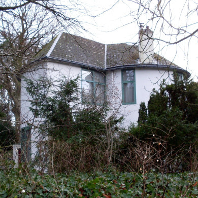 Uit 1911 daterend eenvoudig WOONHUIS op L-vormige grondslag met verdieping en plat afgedekt overstek, geheel opgetrokken in voegloos gewapend beton naar ontwerp van H. Hana en H.J. Harms als technici en H.P. Berlage als esthetisch adviseur.