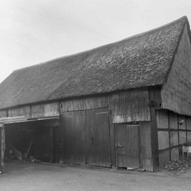 Schuur bestaande uit met baksteen gevulde vakwerkconstructie, brede houten delen en stro-bekleding en gedekt door een rieten wolfdak tegen met stro beklede geveltop met toef; twee stel dubbele deuren. XIX.