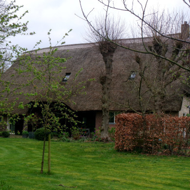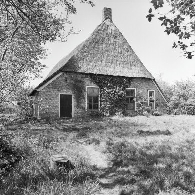 In aanleg 18e eeuwse boerderij onder rieten schilddak met uilebord aan achterzijde, tegen topgevel met schoorsteen waarop jaartal 1746 en vlechtingen aan voorzijde; schoorsteen op scheiding woon- en bedrijfsgedeelte; de voorgevel met bepleisterde plint, 19e eeuwse zesruitsschuifvensters, rechthoe