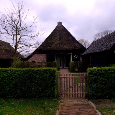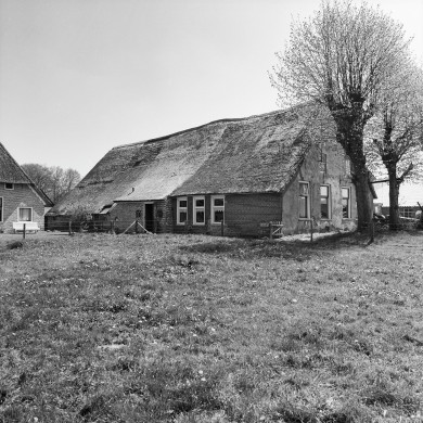 In aanleg 18e eeuwse boerderij onder rieten schilddak met uilebord aan achterzijde, tegen topgevel met schoorsteen waarop jaartal 1746 en vlechtingen aan voorzijde; schoorsteen op scheiding woon- en bedrijfsgedeelte; de voorgevel met bepleisterde plint, 19e eeuwse zesruitsschuifvensters, rechthoe