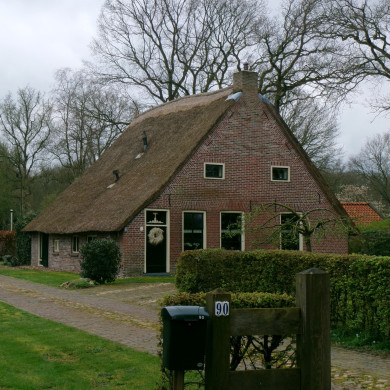 Boerderij met zijbaander en gemetselde stenen topgevel met vlechtingen.