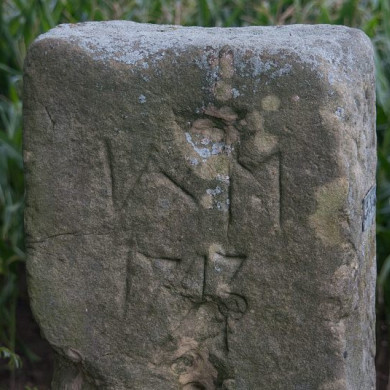 Bentheimerzandsteen; inscripties: EM (Esmarke); VM (Usselermarke); BM (Buursermarke) 1743.