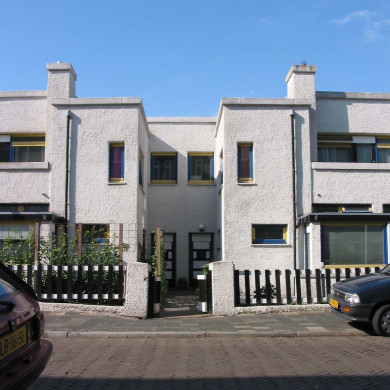 De woningen hebben elk een eigen tuin, omgeven door een houten hek op een lage sokkel tussen blokvormige pijlers van beton; aan de erkers zijn telkens gemetselde bloembakken aangebouwd.
