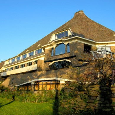 Voor de bouwtijd (1902-1903) zeer vooruitstrevend ontwerp van architect H. van de Velde - in trappehuis en verticale wandversiering in sgraffito van J. Thorn Prikker.