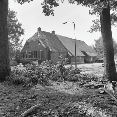 19e eeuwse BOERDERIJ met zijbaander onder deels pannen- deels rietgedekt aan voorzijde afgewolfd schilddak met uilebord; twee schoorstenen, geschulpte en niet-geschulpte windveren; staafankers. In de van een sprong voorziene voorgevel opgeklampte deur met bovenlicht met levensboom en drie zesruitsschuifvensters met opgeklampte luiken; twee rechthoekige zoldervensters.
