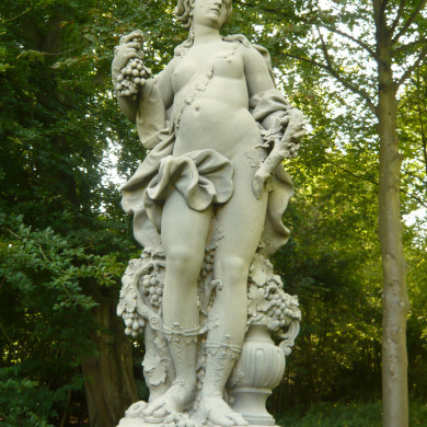 ZANDSTENEN BEELDEN van Bacchus en Ariadne op gezwenkte sokkels, gesigneerd Jan van Logteren 1734, staande te weerszijden van de gezichtsas door het park, niet ver van de waterpartij.