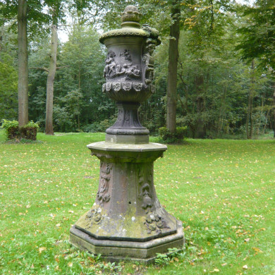 ZANDSTENEN VAAS (XVIIIb, afkomstig uit een kabinet van de aanleg van Speelman), thans opgesteld in de gezichtsas.
