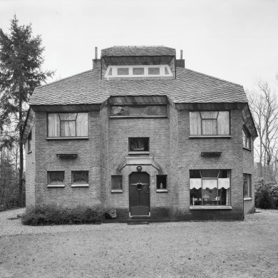 De gevels zijn voorzien van rechthoekige en asymmetrische vier- en vijfhoekige vensters, waarin stalen ramen met een veelal onregelmatige drie-, vier-, vijf- en zeshoekige vlakken vormende roedenverdeling, en van rechthoekige (voorzijde links; achterzijde verdieping), vijfhoekige (in muur tussen huis en garage) en zeshoekige (voor- en achterzijde en garage) deuropeningen en deuren; aan de voorzijde boven de fraai gevormde bronzen voordeur een in stijl ontworpen metalen lamp en een glazen afdak, en aan deze zijde tevens glas-in-lood ramen in de vensters van het trappenhuis en van de dakkapel (houten kozijnen); aan de achterzijde boven de deur in het midden en tussen de bovenzijden van de balcons eveneens een glazen afdak.