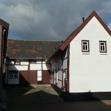 HOEVE om naar voren open binnenplaats. Van mergel, baksteen met speklagen van vakwerk, XVII e.v.