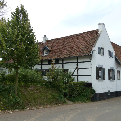 Vakwerkhoeve met binnenplaats, XVIII. Aan de straat een puntgevel van mergel. Segmentboogvensters in Naamse steen.