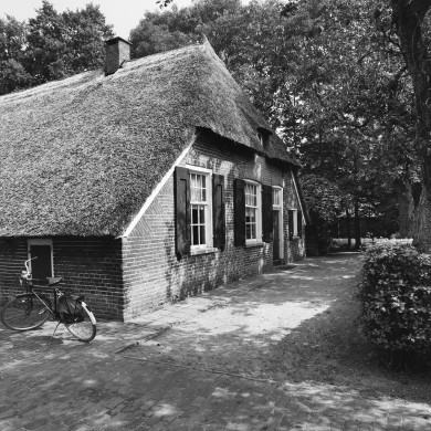 Mooi tussen geboomte gelegen tweede helft 19e-eeuws boerderijcomplex bestaande uit boerderij met middenlangsdeel, twee schuren, stookhok, twee vierroeden-kapbergen en een deels met klinkers bestraat erf.