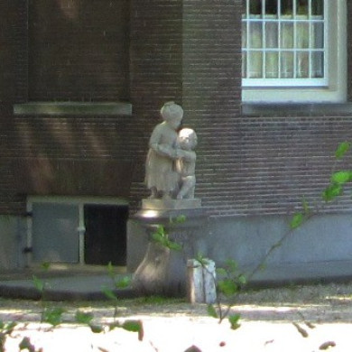 TWEE BEELDGROEPEN. Twee elkaars pendant vormende, natuurstenen beeldengroepen, ieder bestaande uit twee kinderfiguurtjes, blijkens signatuur vervaardigd door Jacob de Graef uit Rotterdam (3e kwart 18e eeuw), op gebeeldhouwde gebuikte natuurstenen Lodewijk XIV-sokkels (2e kwart 18e eeuw); opgesteld bij de hoeken van de hardstenen bestratingsstrook voor het hoofdgebouw.