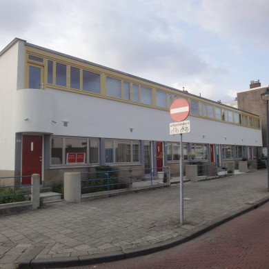 KIEFHOEK. Complex van oorspronkelijk 298 eengezinswoningen - elk met twee bouwlagen, platafgedekt en voorzien van een eigen voor- en achtertuintje - twee winkels, twee werk/bergplaatsen, waterstokerij en kerkgebouw met consistoriekamer en vrijstaande kosterswoning, gebouwd in Nieuw Zakelijke stijl naar ontwerp van J.J.P. Oud in 1925-29, met gebruik van een ten dele op basis van een driehoek ontworpen stratenplan met lange hoofdstraten in de richting NW-ZO, en met haaks daaropstaande verbindingsstraatjes, waarbij aan de NW- en ZO-zijde pleinen met driehoekige grondvorm, voorzien van verhoogde kinderspeelplaatsen, zijn aangelegd en waarbij het kerkelijk complex aan de noordoostelijke rand van het complex is gesitueerd.
