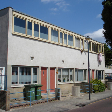 EENGEZINSWONINGEN. De kubusvormige woningen zijn aaneengerijd in langgerekte bouwstroken zonder aanbouwen, opgetrokken in gele baksteen die beneden als hoge plint in het zicht is gelaten en voor het overige geheel is witgepleisterd; bij de winkels en werk/bergplaatsen zijn de hoeken boven afgerond, welke ronde vorm wordt herhaald in de balconnetjes boven de ingangen van de woningen aan de korte verbindingsstraatjes en in de pijlers van de overigens blauw-stalen tuinhekjes.