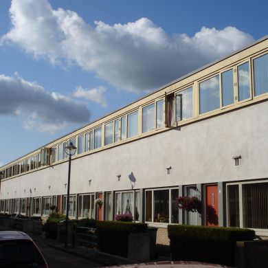 EENGEZINSWONINGEN. De kubusvormige woningen zijn aaneengerijd in langgerekte bouwstroken zonder aanbouwen, opgetrokken in gele baksteen die beneden als hoge plint in het zicht is gelaten en voor het overige geheel is witgepleisterd; bij de winkels en werk/bergplaatsen zijn de hoeken boven afgerond, welke ronde vorm wordt herhaald in de balconnetjes boven de ingangen van de woningen aan de korte verbindingsstraatjes en in de pijlers van de overigens blauw-stalen tuinhekjes.