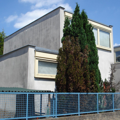 EENGEZINSWONING. De kubusvormige woningen zijn aaneengerijd in langgerekte bouwstroken zonder aanbouwen, opgetrokken in gele baksteen die beneden als hoge plint in het zicht is gelaten en voor het overige geheel is witgepleisterd; bij de winkels en werk/bergplaatsen zijn de hoeken boven afgerond, welke ronde vorm wordt herhaald in de balconnetjes boven de ingangen van de woningen aan de korte verbindingsstraatjes en in de pijlers van de overigens blauw-stalen tuinhekjes.