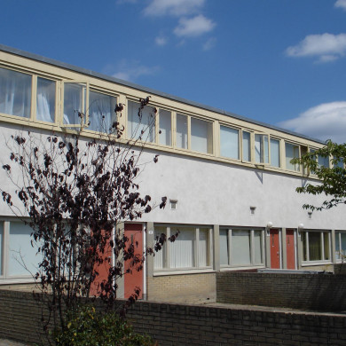 EENGEZINSWONINGEN. De kubusvormige woningen zijn aaneengerijd in langgerekte bouwstroken zonder aanbouwen, opgetrokken in gele baksteen die beneden als hoge plint in het zicht is gelaten en voor het overige geheel is witgepleisterd; bij de winkels en werk/bergplaatsen zijn de hoeken boven afgerond, welke ronde vorm wordt herhaald in de balconnetjes boven de ingangen van de woningen aan de korte verbindingsstraatjes en in de pijlers van de overigens blauw-stalen tuinhekjes.