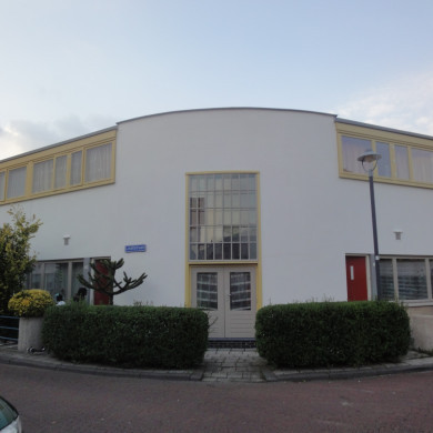 WERK/BERGPLAATS. De oorspronkelijke werk/bergplaatsen hebben eveneens de ingang in de afgeronde hoek, met dubbele blauwe stalen deuren, en een groot bovenlicht met stalen roedenverdeling en matglasruiten. Elk gelegen op een van de hoeken van de (twee) U-vormige complexonderdelen tussen eengezinswoningen.