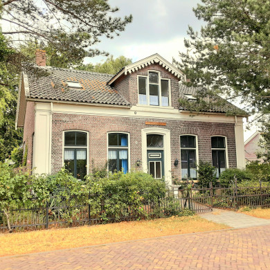 Omschrijving. Het hoofdvolume van het verdiepingloze huis is opgetrokken vanuit een rechthoekige plattegrond en is voorzien van een uitkragend, met pannen gedekt zadeldak met gesneden windveren en twee schoorsteenschachten op de nok. De vijf-assige symmetrische voorgevel is voorzien van gepleisterde hoeklisenen met casementen, getoogde vensters onder strekken en een entree met paneeldeuren onder bovenlicht met ruitvormige roedeverdeling binnen een profiellijst. De opgemetselde dakkapel met samengesteld venster heeft eveneens een zadeldak met gesneden windveren. De linker kopgevel is symmetrisch met twee getoogde vensters op de begane grond en een taatsdraaiend gietijzeren roosvenster in de top van de puntgevel. De rechter kopgevel is identiek. Tegen de achterzijde van het pand staat een lagere uitbouw (het voormalige kantoorgedeelte) onder schilddak. Dit bouwdeel is voorzien van rechtgesloten vensters onder rollaag en een houten ingangsportaaltje. Het giet- en smeedijzeren hekwerk dat het erf aan de wegzijde begrenst heeft eenvoudige Jugendstil-achtige bekroningen.