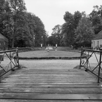 - dat deze vorm extra wordt geaccentueerd door een bijna over de volle lengte aangegeven, grotendeels door bebossing omsloten middenas,