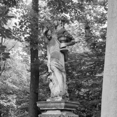 BEELD VAN "POMONA" bij de ronde vijver. Zandstenen beeld (17e eeuw) van vrouw met schaal fruit en aap (?) met vrucht (allegorie van de smaak ?) op niet-passende Lodewijk XIV-sokkels (vroeg-18e-eeuws; van hetzelfde model als de sokkel die als voetstuk dient voor het beeld van Flora).