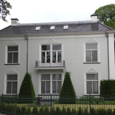 Het pand is opgetrokken vanuit een rechthoekige plattegrond en heeft gepleisterde gevels met schijnvoegen en een verdieping onder met platte Friese pannen gedekt, afgeknot schilddak met gepleisterde schoorsteenschachten op drie van de vier nokhoeken en niet oorspronkelijke, detonerende dakkapellen. De gevels zijn voorzien van plinten, hoeklisenen, gevelopeningen (T-vensters) met afgeronde bovenhoeken binnen met kuif bekroonde profiellijsten, waarin mensfiguren in hoog-reliëf zijn verwerkt. De gevels worden beëindigd door een verkropte, geprofileerde kroonlijst. De voorgevel telt drie brede traveeën met in het midden een risaliet met tweelichtvenster op de begane grond en op de verdieping een dubbele porte brisée, uitkomend op een door consoles ondersteund balkon met het oorspronkelijke smeedijzeren hekwerk. De symmetrische linker zijgevel is eveneens drie-assig en voorzien van een paneel-vleugeldeur met bovenlicht en vensters binnen een omlijsting met kuif als in de voorgevel. Ook de vijf-assige achtergevel is symmetrisch met op de begane grond drie tuin-porte brisées, die evenals de vensters in deze gevel niet zijn omlijst. Tegen de achtergevel staat een trapezoidevormige uitbouw met plat dak, diverse rechtgesloten gevelopeningen en drie ronde gevelopeningen, waarvan twee blind en een met gietijzeren roosvenster in de achterste gevel. Deze uitbouw loopt om de hoek naar de rechter zijgevel, waarin vensters als in de voor- en de rechter zijgevel en een eveneens omlijste porte brisée met bovenlicht. De verdiepings porte brisée is behangen met persiennes en komt uit op de uitbouw. In de grotendeels nog in oorspronkelijke staat verkerende tuin staan onder meer nog een tamme kastanjeboom, treurbeuk, linde, buxushagen en coniferen, alsmede een appelhof uit de bouwtijd van het huis.