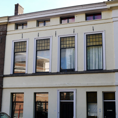 Uit het tweede kwart der 19e eeuw daterend pand met verdieping en mezzanino onder flauwhellend, met pannen gedekt zadeldak, uitgevoerd in streng neo-classicistische trant.