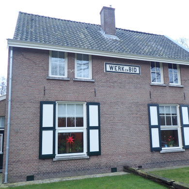 Blok van twee WONINGEN gebouwd in 1889 in opdracht van het Ministerie van Justitie en bestemd voor de zaalopziener eerste rang en de magazijnmeester. Ontwerp, woningtype IV, van W.C. Metzelaar. De naam Werk en Bid staat symmetrisch in de voorgevel.