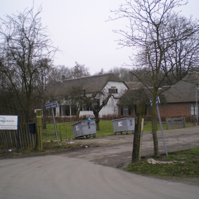 In oorsprong wellicht 17e-eeuwse T-BOERDERIJ - genaamd het Blauwe Huis - onder (vernieuwde) rieten wolfdaken, met latere aanbouw.