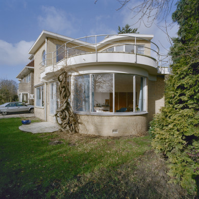 De evenwijdig aan de straat gesitueerde Z-gevel heeft links een blokvormig gedeelte met beneden een groot rechthoekig venster en boven een cirkelvormig venster; rechts sluit de gebogen vleugel aan met een grotendeels glazen pui en op de sterk teruggerooide verdieping met gebogen glasgevel een licht overstekend betonnen terras, voorzien van stalen buisleuningen. De ingang bevindt zich in het midden van de W-gevel, die met uitzondering van het badkamervenster op de verdieping blind is en waarop links, ver teruggerooid, een lage, plat afgedekte garage aansluit. De N-gevel heeft nabij de gebogen vleugel een rondboogvormig venster en voorts een drietal rechthoekige vensters beneden en boven een klein venster. Alle vensters zijn gevat in smalle stalen kozijnen, die evenals de buitendeuren en daklijsten wit van kleur zijn.