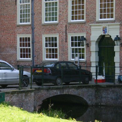 TOEGANGSBRUG AAN ACHTERZIJDE van het kasteel. Boogbrug met convex naar buiten buigende hoofden, voor de restauratie (1958-1963) in de vormen van het 3e of 4e kwart van de 19e eeuw, maar bij de restauratie vernieuwd in 18e-eeuwse geest en toen voorzien van ijzeren balusterleuningen waarvoor twee natuurstenen vazen op dito sokkels.