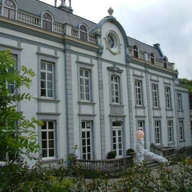 HOOFDGEBOUW. In rode witgeschilderde baksteen opgetrokken onderkelderd hoofdgebouw van twee verdiepingen op rechthoekige grondslag, bestaande uit een middenpaviljoen onder met grijze leien gedekt mansardedak, waarvan de onderste korte dakschilden zijn afgeknot en twee iets lager opgetrokken zijvleugels onder een in de lengte gehalveerd met grijze leien gedekt mansardedak.