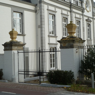 PIJLERS, HEK EN BALUSTRADE. Twee vierkante witgeschilderde rode bakstenen hekpijlers in Lodewijk XVI-stijl uit de tweede helft van de 18e eeuw, afgesloten door een monumentale geprofileerde mergelstenen bovenstuk met afdekplaat en bekroond door een vaasvormig ornamentstuk. De noordoostelijke pijler is door een korte witgeschilderde rode bakstenen muur met het hoofdgebouw verbonden. De pijlers omlijsten een 19e-eeuws dubbel smeedijzeren hek met spijlen met pijlpuntvormige bekroning. Aansluitend aan de zuidwestelijke pijler een 19e-eeuws spijlenhek op een onderdorpel van witgeschilderde rode baksteen, die het tracé van de straat Vliek volgt en die het parkgedeelte aan deze zijde naar de openbare weg afsluit.