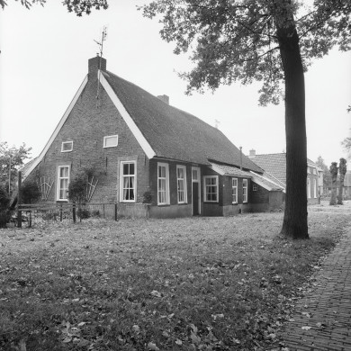 19e eeuwse keuterij met zijbaander en kubbingen, onder deels pannen, deels rietgedekt wolfdak met uilebord aan achterzijde tegen rechte topgevel met vlechtingen en schoorsteen aan voorzijde.