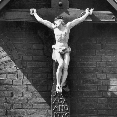 Tegen de gevel een wegkruis met houten corpus, 1776.