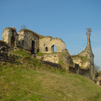 KASTEEL VALKENBURG, verwoest 1672; burchtruine op de steile helling ten zuiden van de stad. Het kasteel, waarvan nog belangrijke muurgedeelten overeind staat, XIX-XV, was aan alle zijden omgeven door een omhoog klimmende versterkte weg, een z.g.