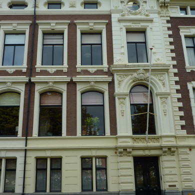 Rechterhelft van dubbel herenhuis uit ca. 1874, gebouwd door architect H.J. van den Brink in eclectische bouwstijl, met voornamelijk aan de renaissance, de Lodewijk XIV- en de Lodewijk XVI-stijl en het Empire ontleende motieven.