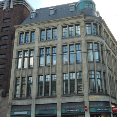 Voormalig modemagazijn uit 1915 op de hoek van de Spuistraat en het Spui in de historiserende stijl van de "Um 1800- Beweging". Het ontwerp onder de naam "Magazijn Nederland" is van de architecten Simons en Van Braningen.