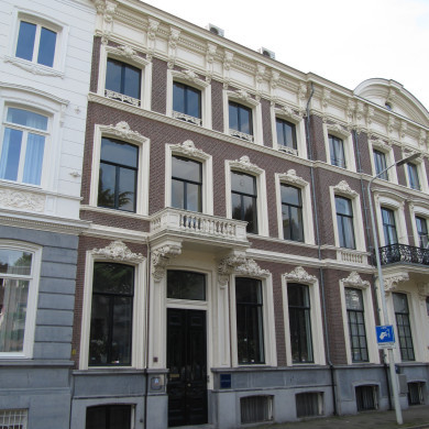 Herenhuis op rechthoekige plattegrond, bestaande uit souterrain en drie bouwlagen onder een met zink gedekte mansardekap, vier vensterassen breed. De bakstenen voorgevel bezit een met natuursteen bekleed souterrain. De bouwlagen worden van elkaar gescheiden door geprofileerde stucwaterlijsten. De ingang, bestaande uit een dubbele paneeldeur, wordt bekroond door een balkon met balusters en smeedijzeren hek, rustend op zware gebeeldhouwde consoles in neo- Lodewijk XIV-trant. De vensters, T-vormige schuifvensters op de eerste en tweede bouwlaag, en stolpramen op de derde, bezitten rijk geprofileerde omlijstingen met sierstukken, bestaande uit een schelp en/of een maskerkop tussen acanthusbladeren. De stolpramen zijn onderaan voorzien van een smeedijzeren hekje. De souterrainramen bezitten ijzeren roosters. De gevel wordt afgesloten door een rijk versierde gootlijst, bestaande uit een fries met rechthoekige panelen, paarsgewijs geplaatste gebeeldhouwde bladconsoles met maskerkoppen, een tand- en een eierlijst. De achtergevel is gepleisterd met ingekraste groeven en afgesloten door een eenvoudige gootlijst op klossen en rechthoekige panelen in het fries. Het twee assen brede linkerdeel is als risaliet uitgebouwd. Op de eerste bouwlaag zijn een door architect Mutters in 1913 gebouwde serre met glas-in-lood bovenlicht, en veranda gesitueerd, voorzien van houten pilasters en een ijzeren balustrade. Het geheel rust op smalle, ronde pijlers, waaronder het souterrain. De tweede en derde bouwlaag bevatten zes-ruits schuifvensters, waarvan twee met een smeedijzeren hekje. Interieur met onder meer bewaard gebleven rijke eclectische afwerkingen.