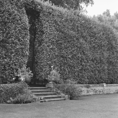 BAKSTENEN KEERMUUR ROND DE VERDIEPTE WESTELIJKE PARTERRE. Lage rode bakstenen keermuur met zandstenen afdekplaat op vierkante grondslag, waarin twintig zandstenen voetstukken voor vazen zijn opgenomen. De keermuur, die in de jaren 1886- 1900 rond de verdiepte parterre ten westen van de oprijlaan is opgetrokken, is centraal aan de vier zijden voorzien van een trap van vijf treden, die naar de parterre voert.