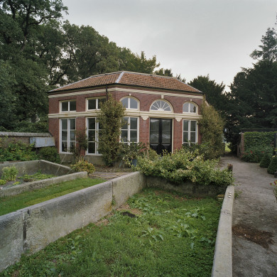 ORANJERIE. Onderkelderde in rode baksteen opgetrokken oranjerie op zeshoekige grondslag. Het met rode pannen gedekt schilddak is afgeknot. De oranjerie is in ca. 1886 in de NO-hoek van de moestuin opgetrokken.