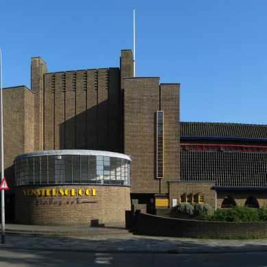 Inleiding SCHOOLGEBOUW MET OMMURING, gesitueerd evenwijdig aan de zuidkant van de Parkweg en georiënteerd op de hoofdas van de tegenoverliggende Grunobuurt (de Westinghousestraat), gebouwd in 1927 als zes- en zevenklassige openbare lagere school met gymnastieklokaal in opdracht van de gemeente naar ontwerp van Gemeentewerken (S.J. Bouma) in de stijl van de Amsterdamse School. Het gebouw is aan weerszijden door smalle gangen gescheiden van de aangrenzende, latere bebouwing. De gymnastiekzaal is gemoderniseerd en thans in gebruik als kantine. Het gebouw is thans nog steeds in gebruik als school. Omschrijving Het twee bouwlagen tellende gebouw is opgetrokken op een langgerekte, rechthoekige plattegrond en is volkomen symmetrisch van opzet: een centraal gelegen monumentale ingangspartij met een naar de straatzijde uitgebouwde, halfronde gymnastiekzaal en twee lange vleugels waarin de leslokalen zijn ondergebracht. Het voorerf is van de straat gescheiden door een ca. 0.75 meter hoge muur van gele baksteen met rondingen naar de centrale toegang; voor het gymnastieklokaal een cirkelvormig troittoir van klinkers. De gevels zijn opgetrokken uit gele baksteen (Waalsteen); de muurvlakken van de ingangspartij zijn opgemetseld in koppenverband. De middenpartij waarin de twee trappenhuizen aan weerszijden van de halfronde uitbouw zijn ondergebracht, is samengesteld uit ten opzichte van elkaar verspringende kubische volumes met platte daken, bakstenen lisenen en op de hoeken twee verticale vensterstroken met gekleurd glas-in-lood. De halfronde uitbouw heeft een grote pui van glas met een fijnmazige stalen roedevedeling. Aan beide zijden ervan ligt een entree in een diepe nis met origineel hang- en sluitwerk. Op de begane grond van de vleugels bevinden zich reeksen gemetselde spitsbogen op natuurstenen negblokken, met verdiept liggende, stalen spitsboogvensters. De verdiepingslaag gaat schuil achter een steil dakvlak, belegd met een blauwbruin genuanceerde, Romaanse pan. Op driekwart hoogte van het dakvlak een doorlopende, kepervormige vensterreeks met stalen kozijnen, die de achterliggende gang verlicht, onder een geprofileerde houten goot met overstek. De achtergevel aan de ruime speelplaats heeft brede, grote houten raampartijen met een roedeverdeling. De entree in het midden heeft een betonnen luifel. Het bovenste deel van het gevelvlak boven de entree is belegd met verticaal aangebrachte dakpannen. Inwendig ondermeer van belang de trappenhuizen met granieten traptreden, fraai bewerkte teakhouten trapleuningen en de rechthoekige glas-in-loodvensters met geometrische motieven in heldere kleuren. De lamp, een samenstelsel van metalen stangen, bollen en buizen van wit glas ligt gedemonteerd op de zolder. Waardering Schoolgebouw met ommuring, als waardevolle representant van de Amsterdamse School-architectuur van algemeen belang vanwege zijn grote architectuurhistorische waarde en vanwege de architectonische gaafheid van het exterieur alsmede vanwege zijn stedebouwkundige situering in ruimtelijke relatie met de tegenover liggende Grunobuurt en vanwege de kwaliteit van het ontwerp, dat mag worden beschouwd als een van de hoogtepunten in het oeuvre van de Groninger architect S.J. Bouma.